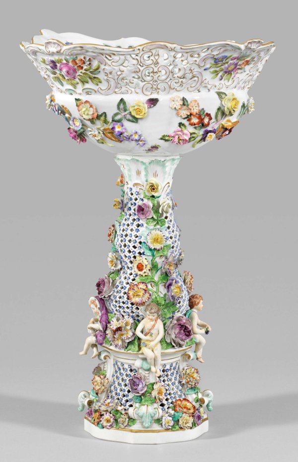 Prächtiger Tafelaufsatz mit Allegorien der vier Jahreszeiten Über hochgezogenem, passig geschweiftem Sockel mit stark reliefplastischen, eingerollten Voluten balusterförmiger Schaft mit bauchig vorwölbender, tief gemuldeter Schale. Floral bzw. gitterwerkartig durchbrochen gearbeiteter Korpus, in den Schnittpunkten mit reliefierten, blau-gelben Vergissmeinnichtblüten, umzogen von fein modellierten, plastisch aufgelegten Blütenranken. Unterhalb sitzende Putten mit Blüten, Ährenbündel, Weintrauben und Kohlenschale als Personifikation des Frühlings, Sommers, Herbst und Winters. Auf Außen- und Innenwandung große, farbenprächtige Blumenbuketts bzw. Streublumen. Polychrome Malerei mit Goldstaffage. Minim. rest.; Manufakturmarke. H. 62 cm.