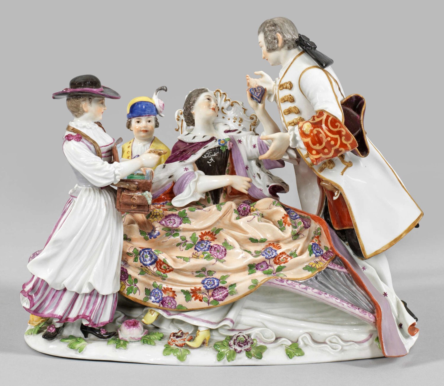 "Der Herzdosenverkauf". Originaltitel Unregelmäßiger, mit plastischen Blüten belegter Sockel. Auf einem Stuhl sitzende Dame in einem mit Indianischen Blumen gemustertem Kleid und hermelinbesetztem Umhang, ihrem Verehrer eine Herzdose zeigend. Seitlich stehende Tirolerin mit geöffnetem, gefülltem Schmuckkasten, während ein im Hintergrund verweilender Diener ein Tableau mit Schmuck präsentiert. Polychrome Malerei mit Goldstaffage. Entw. Johann Joachim Kaendler. Minim. rest.; Brandriss. Schwertermarke. H. 21 cm. 24 cm x 13 cm.