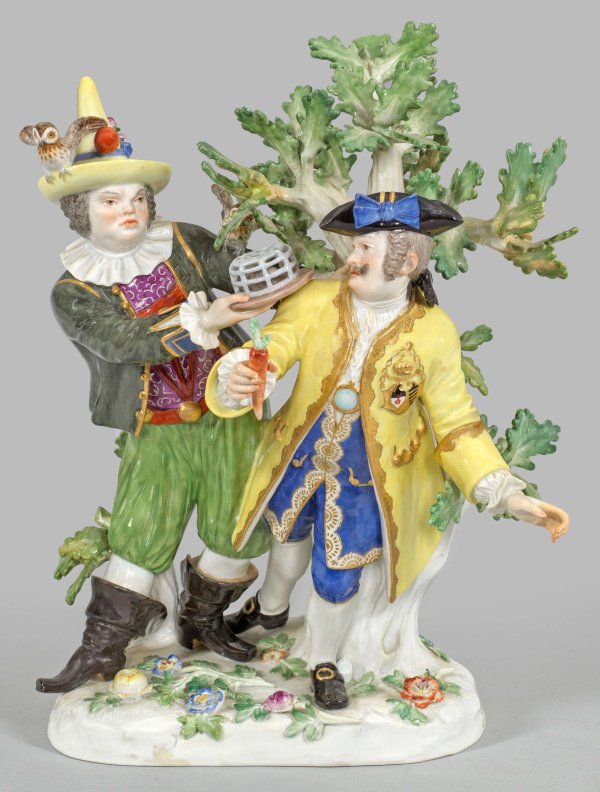 "Hofnarr Fröhlich und Schmiedel". Originaltitel Unregelmäßiger, mit plastischen Blüten und Blättern belegter Sockel. An einem Eichenbaum stehender Hofnarr Fröhlich in farbigem Kostüm, auf seinem Hut eine Eule sitzend. Seinem Mitstreiter, dem Hofnarr Schmiedel eine gefangene Maus in einem Käfig darbietend. Polychrome Malerei mit Goldstaffage. Teilw. rest.; Minim. best.; Schwertermarke. H. 27,5 cm. 21 cm x 18 cm.