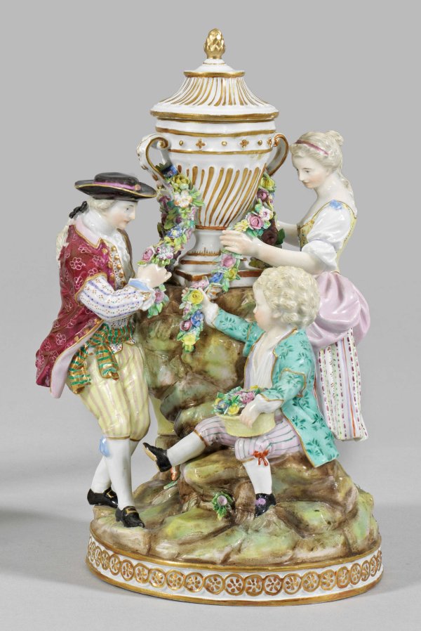 Gärtnergruppe mit Vase Auf rundem Felssockel mit reliefierter Ornamentbordüre stehender junger Herr mit Dame in sommerlicher Kleidung, eine Deckelvase mit einer Blumengirlande schmückend. Unterhalb sitzender Knabe mit Blumenkorb. Polychrome Malerei mit Goldstaffage. Entw. Michel Victor Acier. Minim. best./rest.; Schwertermarke. H. 24 cm.