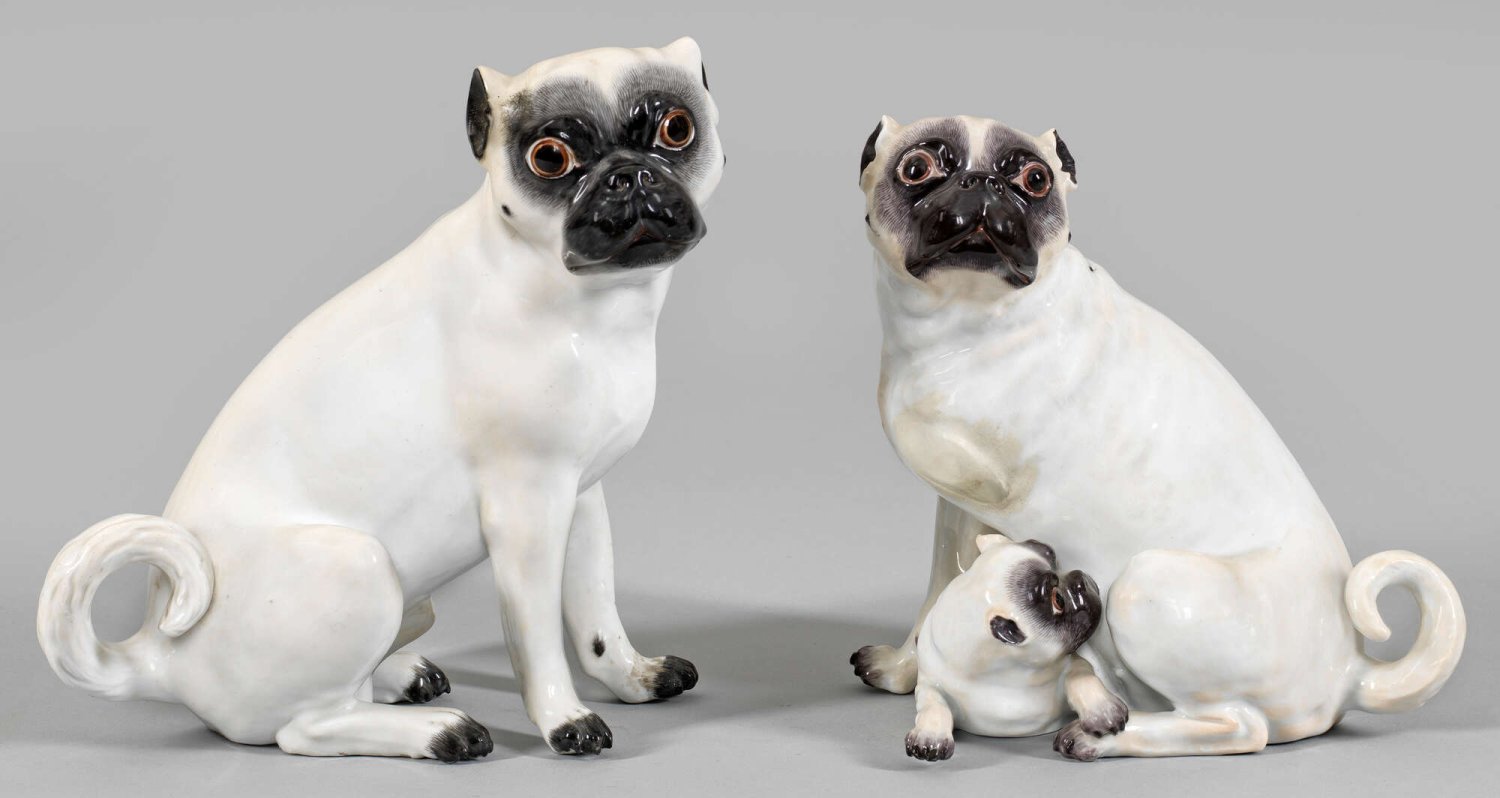 Paar Mopsfiguren Nach links bzw. nach rechts sitzende Mopshündin mit Jungem sowie sitzender Mops mit nach vorn gewandtem Kopf. Naturalistische Fellzeichnung in braunen und schwarzen Tönen. Entw. Johann Joachim Kaendler. Teilw. besch./rest.; Schwertermarke. H. 21,5 cm - 24,5 cm.
