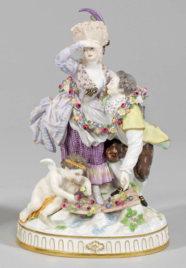 "Die zerbrochene Brücke". Originaltitel Ovaler, felsartiger Natursockel mit Reliefbordüre. Vor zerbrochener Brücke stehendes galantes Paar mit Blumengirlande. Zu ihren Füßen sitzender Amor, die Bruchstücke mit Blüten schmückend. Polychrome Malerei mit Goldstaffage. Entw. Michel Victor Acier. Minim. rest./besch.; Schwertermarke. H. 25 cm.