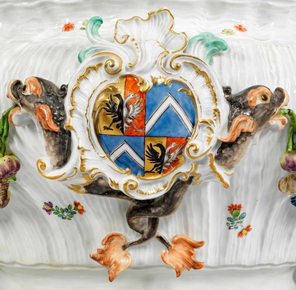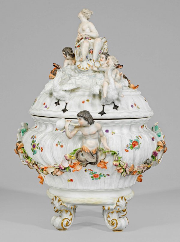 Runder, von vier stark reliefplastischen Voluten mit Muscheln getragener, gedrückt bauchiger Korpus mit hochgewölbtem Deckel. Als Bekrönung die sich, über reliefplastischem Wellendekor erhebende, große Figur der Göttin Venus mit goldstaffiertem Diadem und blumig gemustertem Hüftschleier, in einem von Schwänen gezogenen Muschelwagen sitzend, umgeben von wasserspeienden Delphinen und Tritonen. Auf der Wandung flächendeckendes Muschelrelief. Seitlich vollplastisch modellierte Handhaben in Gestalt von fischschwänzigen, in Muschelhörner blasenden Tritonen. Schau- und rückseitig große, von gegenständigen Delphinen gehaltene Rocaillekartusche mit dem Wappen Heinrich von Brühls, durch Festone aus Blüten, Korallen, Muscheln und Schnecken mit den Tritonen-Handhaben verbunden. Umlaufend feiner Dekor aus Indianischen Blumenzweigen und gestreuten Blüten. Polychrome Malerei mit Goldkonturierung. Entw. Johann Joachim Kaendler, 1738. Schwertermarke. H. 63 cm.