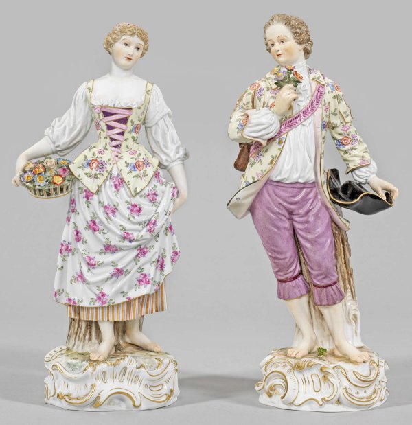 Paar Gärtnerfiguren Gegenstücke. Auf rocaillereliefiertem Sockel stehende Gärtnerin bzw. Gärtner in sommerlicher, barocker, mit Blüten gemusteter Kleidung in der Hand einen Blumenkorb bzw. einen Blumenstrauß sowie schwarzen Hut haltend. Polychrome Malerei mit Goldstaffage. Entw. Ernst August Leuteritz. Minim. best./rest.; Schwertermarke. H. 33,5 cm - 34,5 cm.