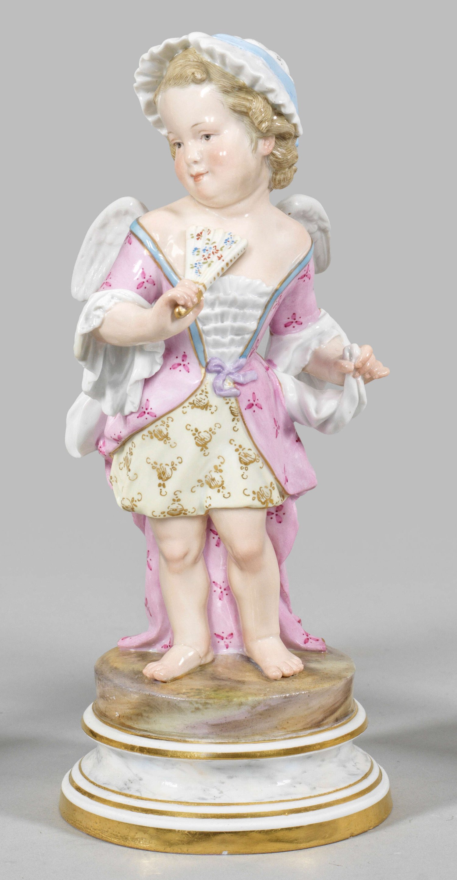 "Amor als Kokette". Originaltitel Auf profiliertem Rundsockel in koketter Pose stehendes Amorettenmädchen in höfischer Kleidung mit Haube, in ihrer rechten Hand einen Fächer haltend. Polychrome Malerei mit Goldstaffage. Entw. Heinrich Schwabe. Modell-Nr. L 111. Minim. rest.; Schwertermarke. H. 21,5 cm.