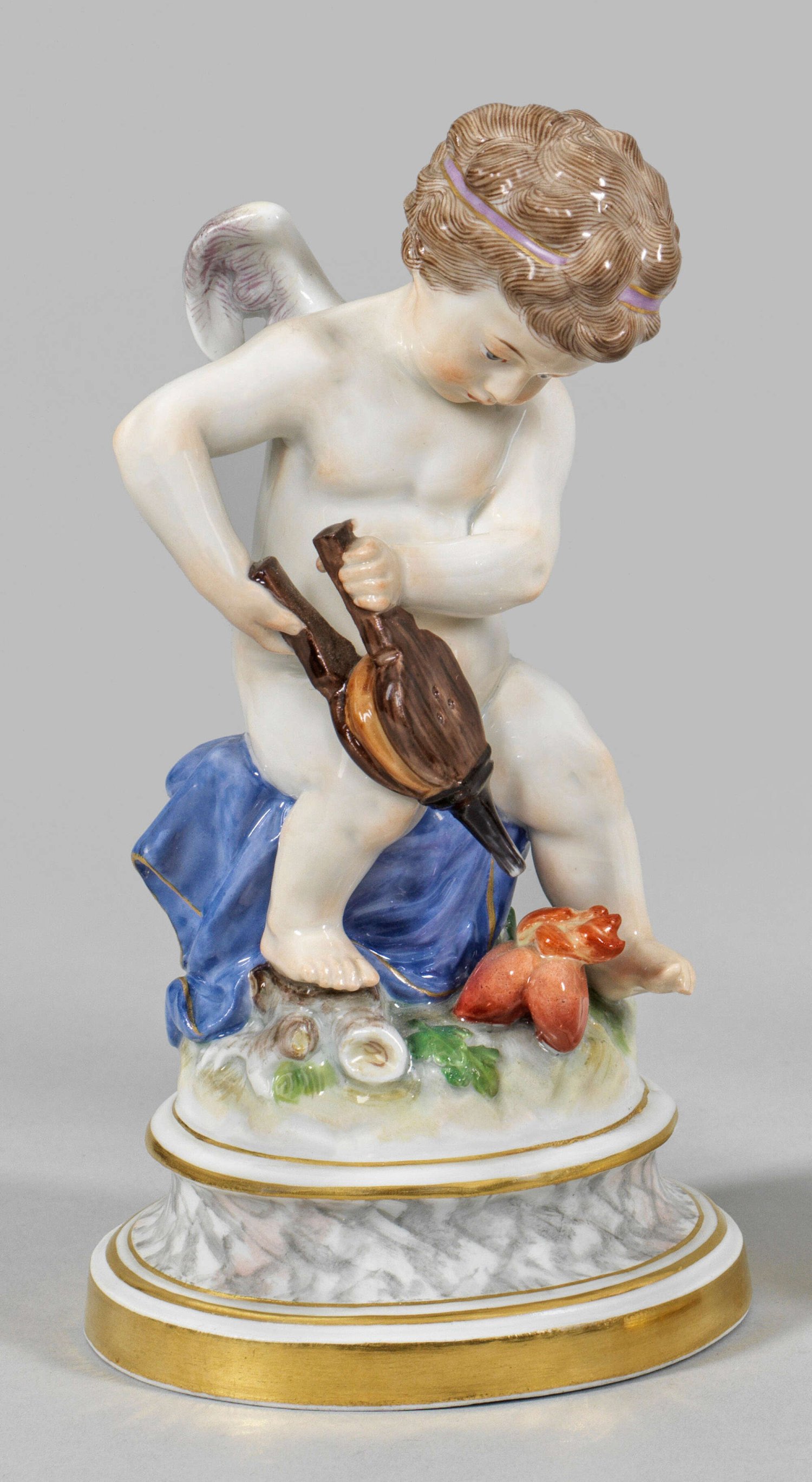 A porcelain figure of a cupid blowing a fire. Crossed swords mark.
