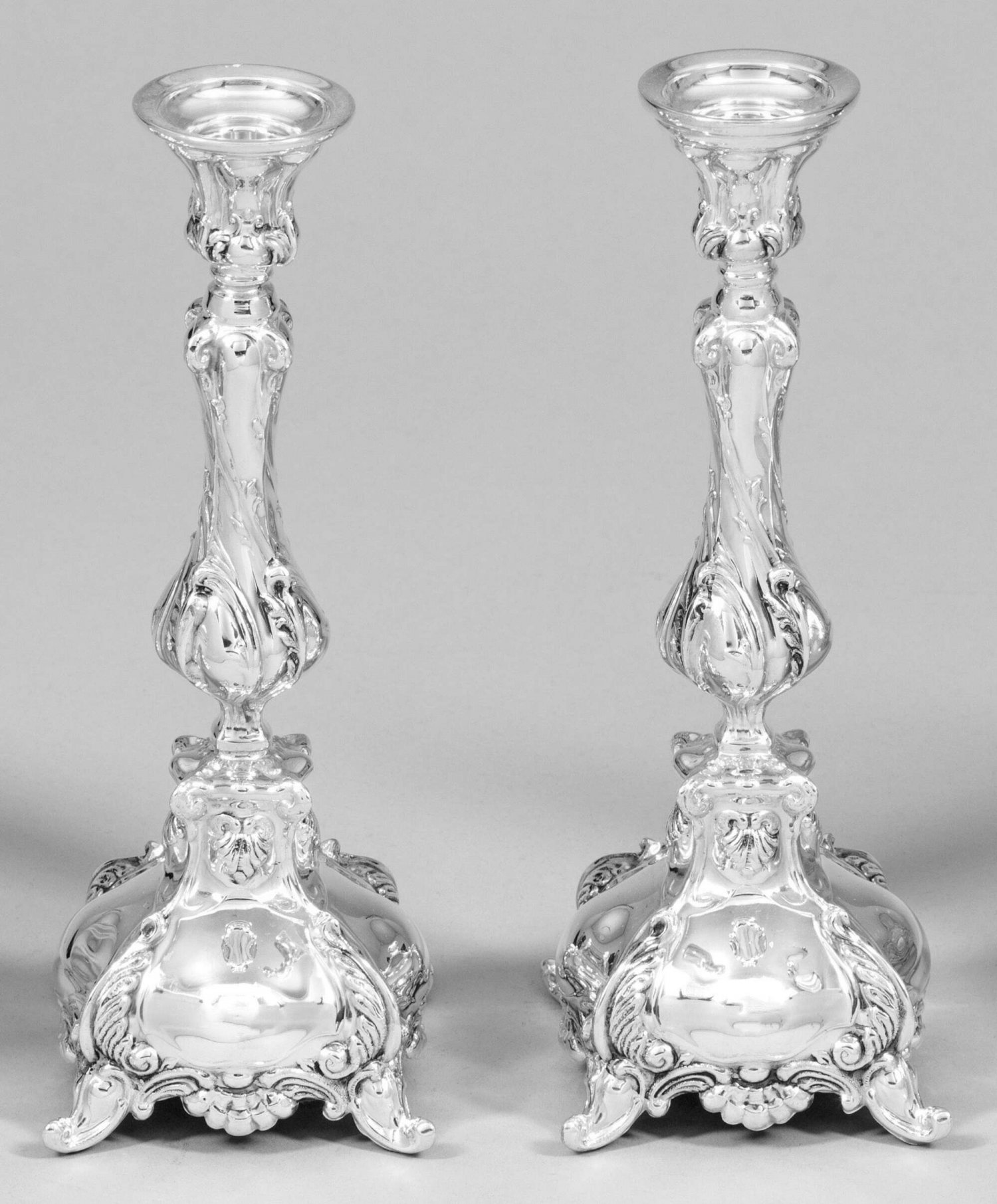 Paar Tafelleuchter im Barockstil Von Volutenfüßen getragener, godronierter Stand, beschwert. Mehrfach gegliederter Balusterschaft mit konisch ausgestellter Tülle. Reicher Reliefdekor aus Blüten, Blättern und Rocaillen. Gest. 925. H. 24,5 cm.