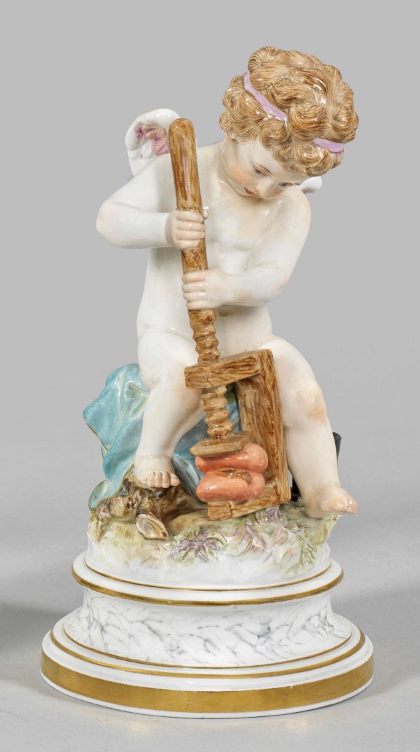 "Amor, zwei Herzen zusammenleimend". Originaltitel Auf profiliertem Rundsockel sitzender Amor, zwei Herzen mit einer Schraubzwinge zusammenpressend. Entw. Heinrich Schwabe. Modell-Nr. L 107. Unw. rest.; Schwertermarke. H. 18 cm.