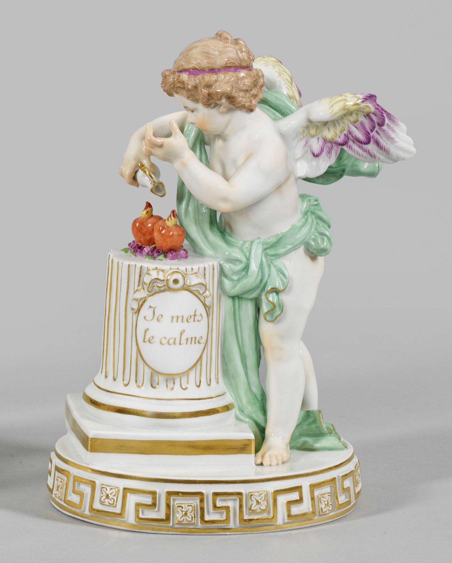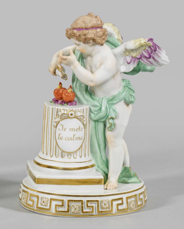 Devisenkind "Amor mit zwei Herzen" Runder Sockel mit reliefiertem Mäanderfries. An einem Säulenstumpf lehnender, geflügelter Amor, zwei auf Rosen gebettete Flammenherzen gießend. Polychrome Malerei mit Goldstaffage. Entw. Michel Victor Acier. Säule bez. "Je mets le calme". Schwertermarke. H. 20 cm.