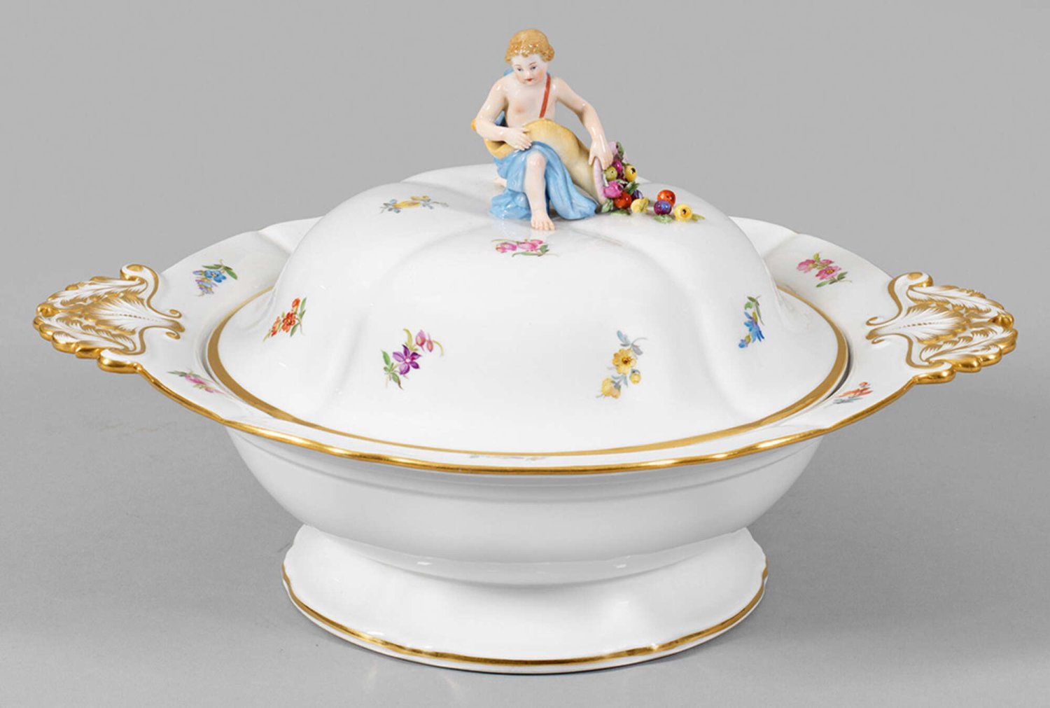 Deckelterrine mit Streublumendekor Runder, leicht gebauchter Korpus auf Rundfuß mit aufgewölbtem Deckel, mittig plastischer Knauf in Gestalt einer Amorette mit Füllhorn. Beidseitig blattreliefierte Henkel. Deckel und Rand mit gestreuten Blumen. Polychrome Malerei mit Goldstaffage. Minim. best.; Schwertermarke. H. 20 cm.