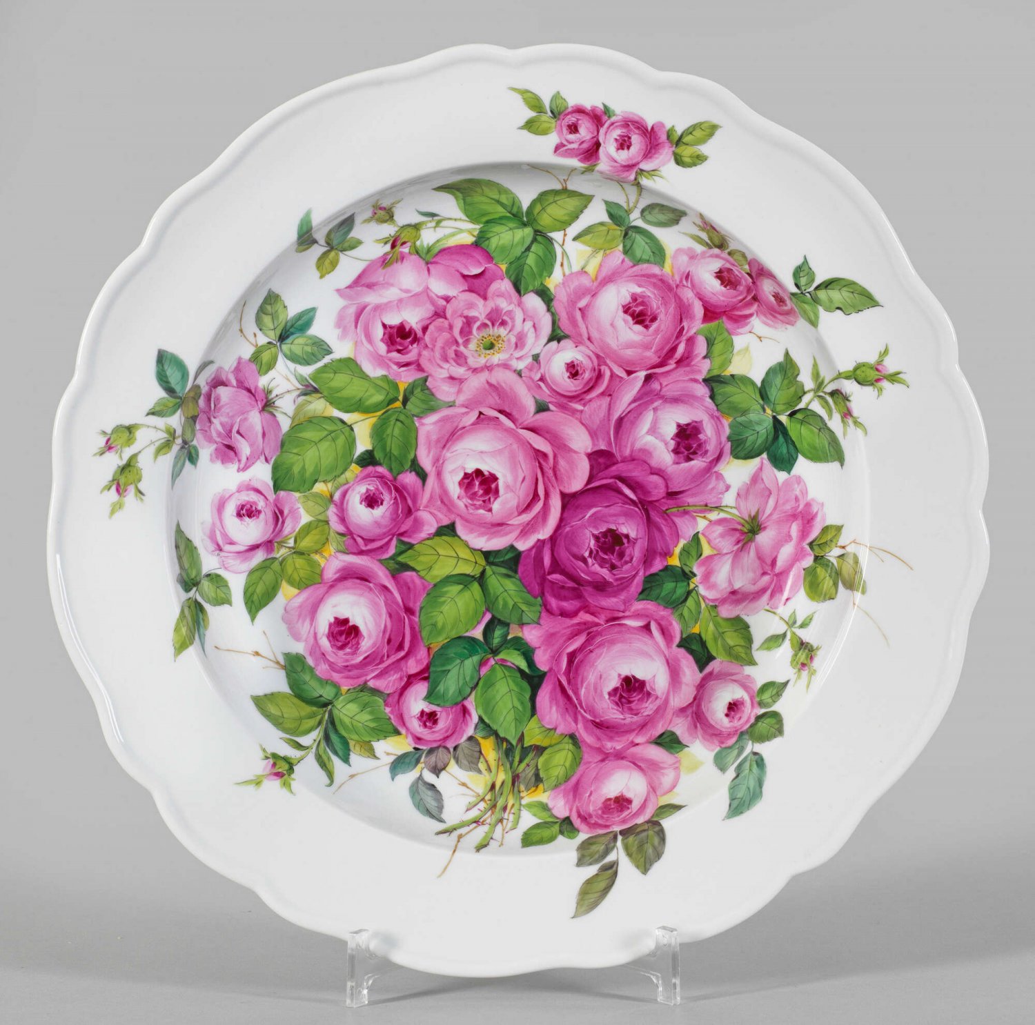 Große Zierschale mit Rosendekor Runde, tief gemuldete Form mit fassoniertem Profilrand. Im Spiegel und auf der ansteigenden Fahne flächendeckende Darstellung mit großem Bukett aus roten Rosenblüten. Farbenprächtige, polychrome Malerei. Schwertermarke. D. 39 cm.