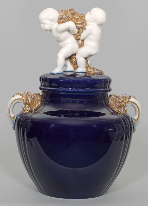 Große Deckelvase Auf rundem Stand sich zur Schulter stark vorwölbender Korpus mit einschwingendem Hals. Durch vertikale Profilrillen gegliederte glatte Wandung. Beidseitig kleine C-förmige Henkel mit reliefierten Blumenranken am oberen Ansatz. Aufgewölbter Deckel als Sockel für plastische Gruppe von zwei Putten, einen Blütenkranz tragend. Kobaltblau glasierter Korpus und Deckel, weiß glasierte Figuren mit vergoldetem Reliefdekor. Vasen-Entw. Paul Schley, Deckel-Entw. Willy Brummer. Modell-Nr. 9753, 9573 a, Modelleintragung 1911. Jahreszeichen. Zeptermarke. H. 67 cm.