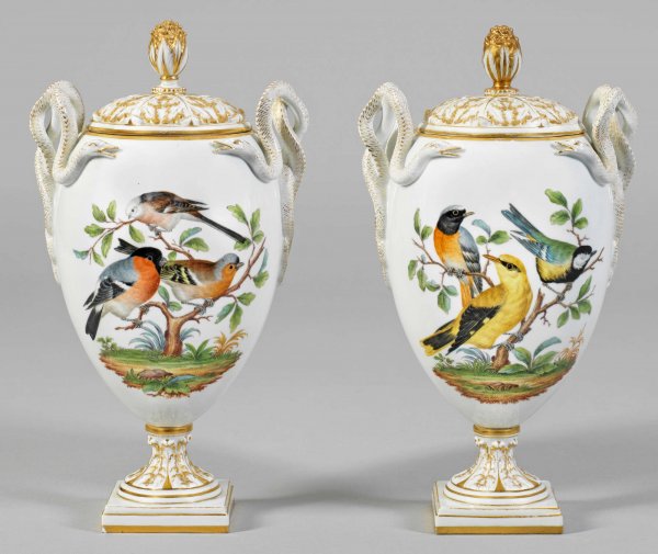 Paar Deckelvasen mit Schlangenhenkeln und Vogeldekor Ovoider Korpus über hochgezogenem Rundfuß auf quadratischer Plinthe. Leicht gewölbter Deckel mit plastischem Früchteknauf. Seitlich aufsteigende Henkel in Gestalt eines sich windenden Schlangenpaares. Umlaufender, goldstaffierter Reliefdekor aus Akanthusblättern auf Fuß und Deckel. Beidseitig der Wandung großflächige Darstellung von heimischen Wald- und Singvögeln in naturalistischer, polychromer Malerei. Teilw. rest.; Minim. besch.; Schwertermarke. H. 30 cm.