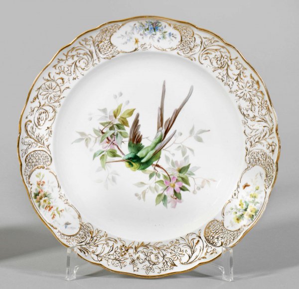 Zierteller mit Vogelmalerei Runde Form mit fassoniertem Rand. Im leicht vertieftem Spiegel ein Eisvogel, auf blühendem Blumenzweig sitzend. Auf der Fahne floraler Reliefdekor im Wechsel mit kartuschengerahmten Blumengebinden und Schmetterlingen. Weiche, polychrome Malerei mit reicher Goldstaffage. Schwertermarke. D. 24,5 cm.