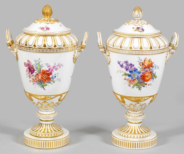 Paar Deckelvasen mit Blumendekor sog. Weimarvase. Auf mehrfach gegliedertem Rundfuß ovoider Korpus mit hochgezogenen Henkeln, umzogen von unterschiedlichen reliefierten, goldkonturierten Ornamentfriesen sowie einer sich windenden, in den Schwanz beißenden Schlange. Auf ansteigendem gehöhten Deckel plastischer Früchteknauf mit Blattrosette. Beidseitig der Wandung großes, farbenprächtiges Blumenarrangement und auf dem Deckel kleine gestreute Blumen in polychromer Malerei. Reicher, teilw. radierter Golddekor. Zepter- und Malereimarke. H. 44 cm.
