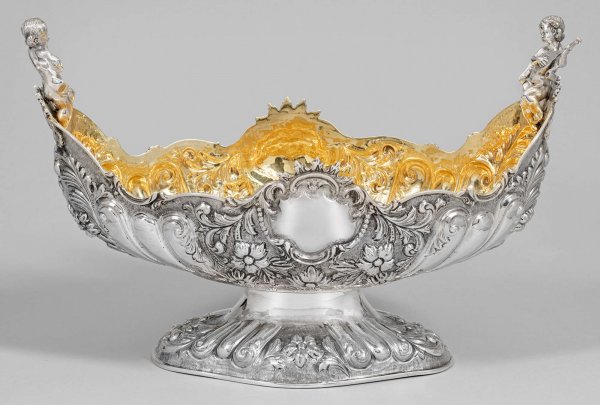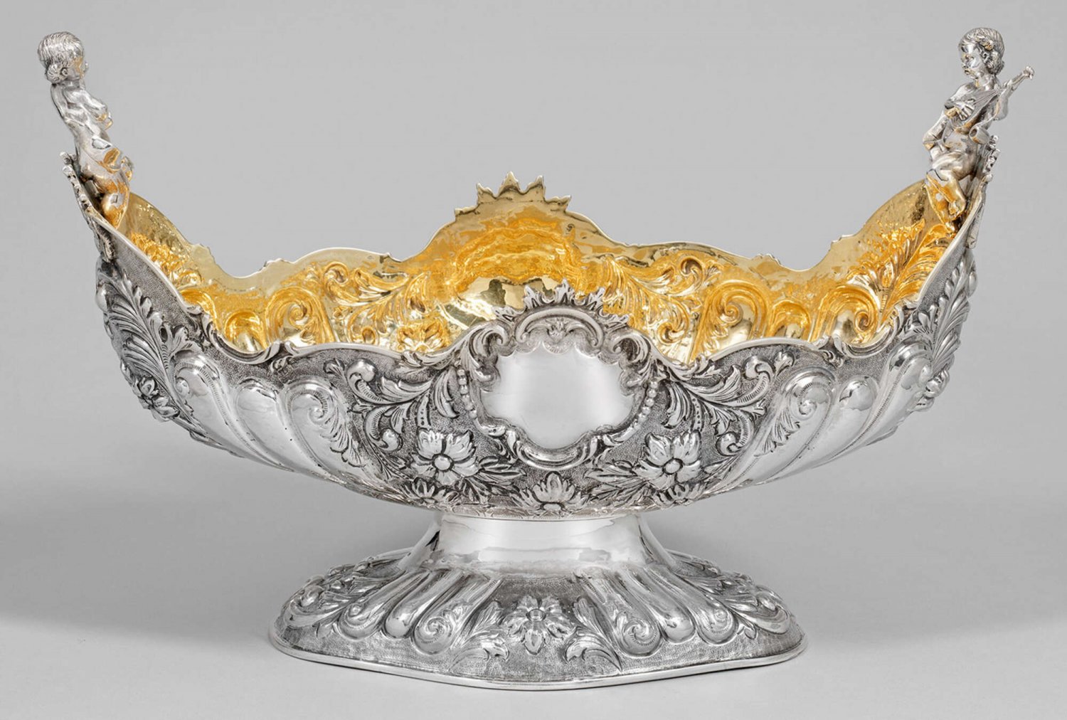 Große Prunkschale Silber. Über passigem Stand ovaler Korpus mit flächendeckendem, hohem Reliefdekor aus Blattwerk, Blüten und Godronen im Rokokostil. Hochgezogene Schmalseiten mit vollplastischen, musizierenden Amoretten als Griffe. Innen vergoldet. Gest. 925. Gew. ca. 2380 g. H. 31 cm. 50 cm x 27,5 cm.