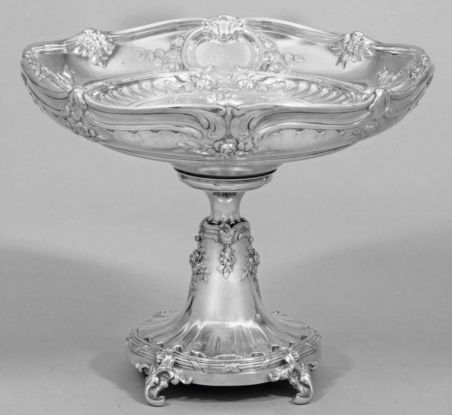 Dekorativer Wiener Tafelaufsatz Silber, beschwert. Von Volutenfüßen getragener profilierter Stand mit Kreuzband-, Floral- und Rocaillendekor. Leicht gemuldete Schale am Anstieg umzogen von einem Zungenfries. Breite Fahne gegliedert durch reliefplastische Volutenkartuschen mit Blütengirlanden. Gest., Beschaumarke, Herstellerzeichen. H. 23 cm. D. 29 cm.