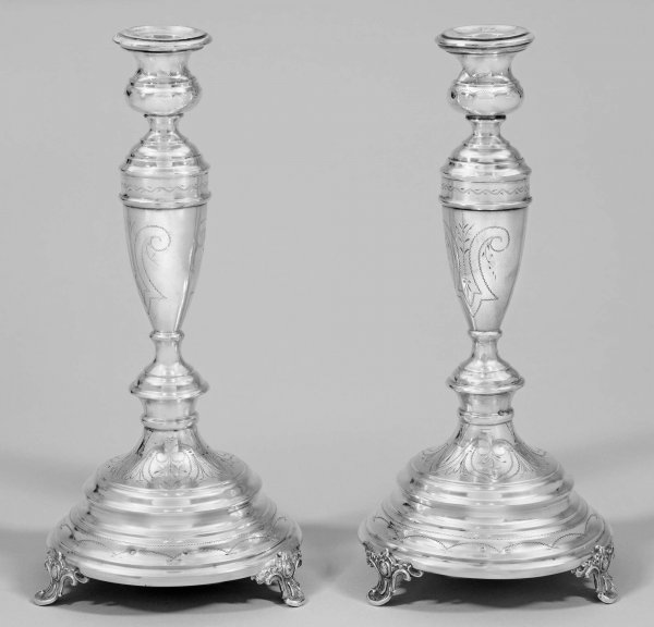 Paar Kerzenleuchter Silber. Auf drei Rocaillefüßen stehender, mehrfach pyramidal getreppter Rundfuß in Balusterschaft übergehend. Fein gravierter, stilisierter Floraldekor. Minim. gedellt. Gest. Garantiemarke Dianakopf, Herstellerzeichen JB, wohl Josef Bachmann (wird Meister 1867). Gew. ca. 650 g. H. 30,5 cm.