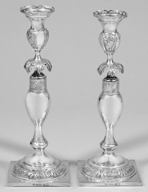Paar große Empire-Tafelleuchter Silber. Vierseitiger, auf quadratischer Plinthe gefußter runder Stand. Hoher Schaft mit reliefplastischem Palmettenfries. Oberer Abschluss im Durchbruchdekor. Gest. 84, Beschaumarke Alexander Mianowsky (tätig 1854-1861), Meister M. Goldsmid (wird Meister 1857). Gew. zus. ca. 900 g. H. 34,5 cm.