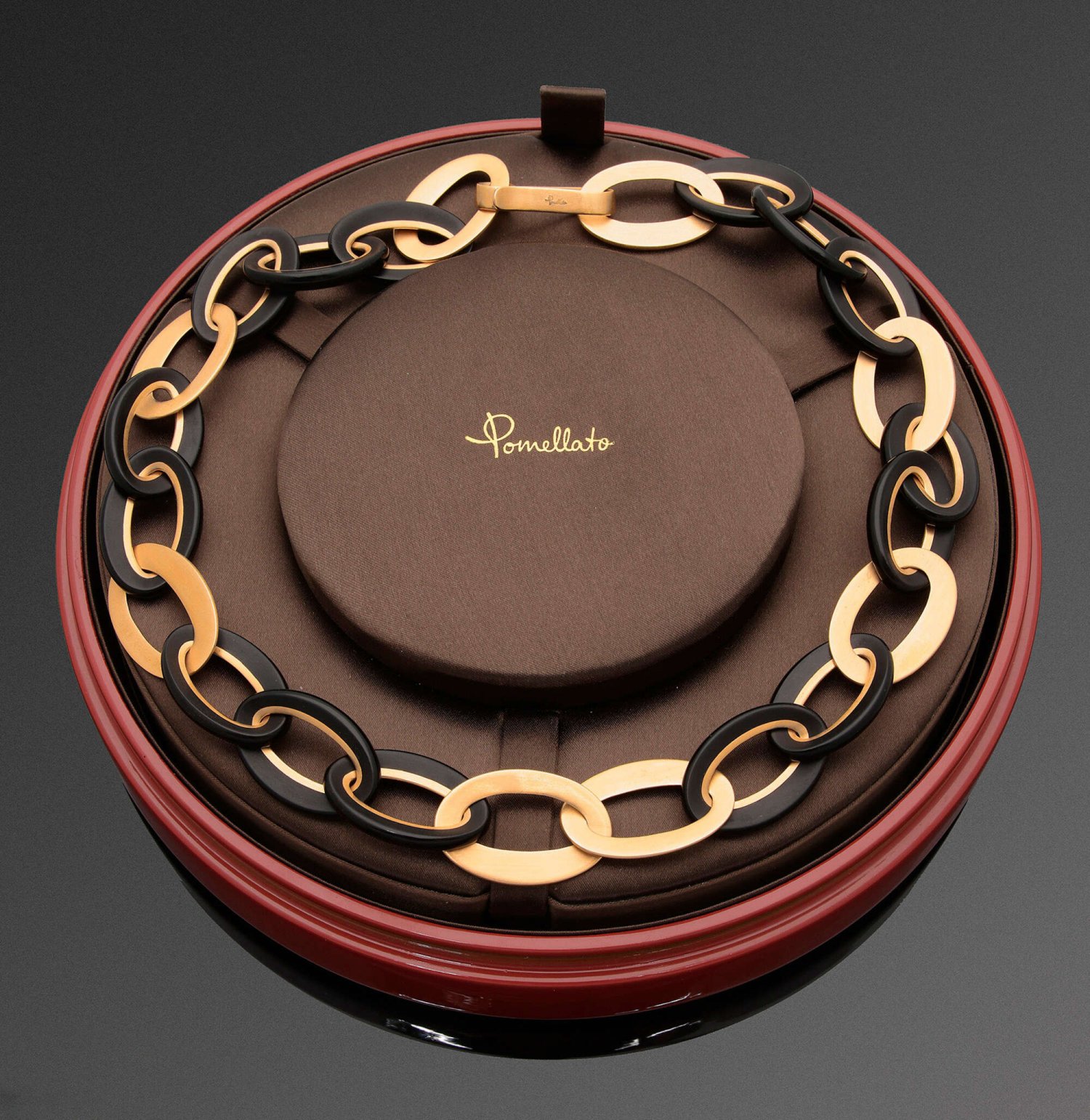 A necklace by Pomellato "Victoria", in 18 k red gold and ebony. Manufacturer's mark and numbered P900012224. Original box and paper. Original lacque box.