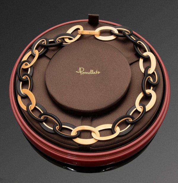 Extravagantes Collier von Pomellato aus der Kollektion "Victoria". Roségold, gest. 750. Einreihige Kette aus Olivenförmigen, durchbrochen gearbeiteten, mattierten Gold- und Ebenholzgliedern. Herstellerzeichen. Ref.-Nr. P900012224. Originale Lackdose und Identifikations-Karte. Gew. ca. 108,52 g.