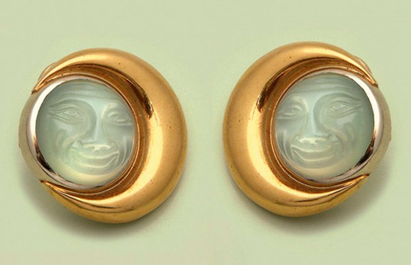 Gelbgold, 18 ct. Dekorativ gestaltet in Form eines Vollmondes, besetzt mit zwei Mondstein-Cabochons mit erhaben geschnittenen Gesichtern. Herstellerzeichen. Ges.-Gew. ca. 35,21 g. Sehr feine Goldschmiedeausführung aus dem Atelier der international bekannten Hamburger Schmuck-Designerin Colleen B. Rosenblat. Herstellerzeichen.