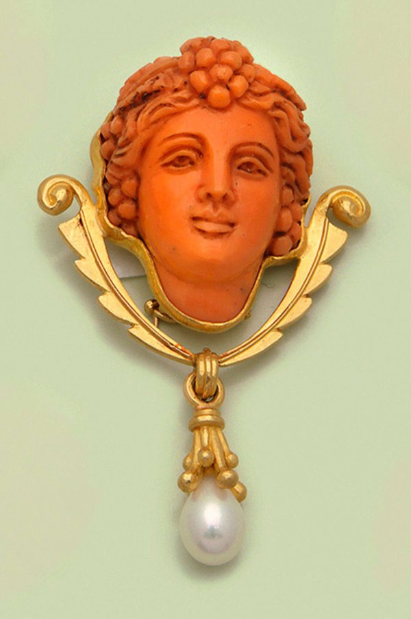 Korallen-Brosche von Frank Kutzick, Hamburg aus der Kollektion "Mutabor". Gelbgold, 22 ct. Vollplastisch geschnittener Kopf einer jungen Römerin aus lachsfarbener Engelshaut-Koralle, flankiert von Lorbeerzweigen, unterhalb abschließend eine weiße Zuchtperle in sehr farbintensivem rosé-grün changierendem Lüster. Herstellerzeichen. Gew. ca. 30,64 g. Sehr feine Goldschmiedeausführung.