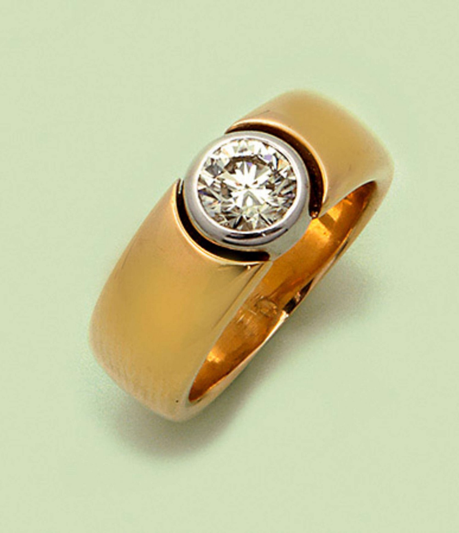 Klassischer Bandring mit Brillantsolitär Gelbgold, gest. 750. Zentral besetzt mit einem Brillanten von zus. ca. 0,91 ct. (M-Z/if). Gew. ca. 14,45 g.