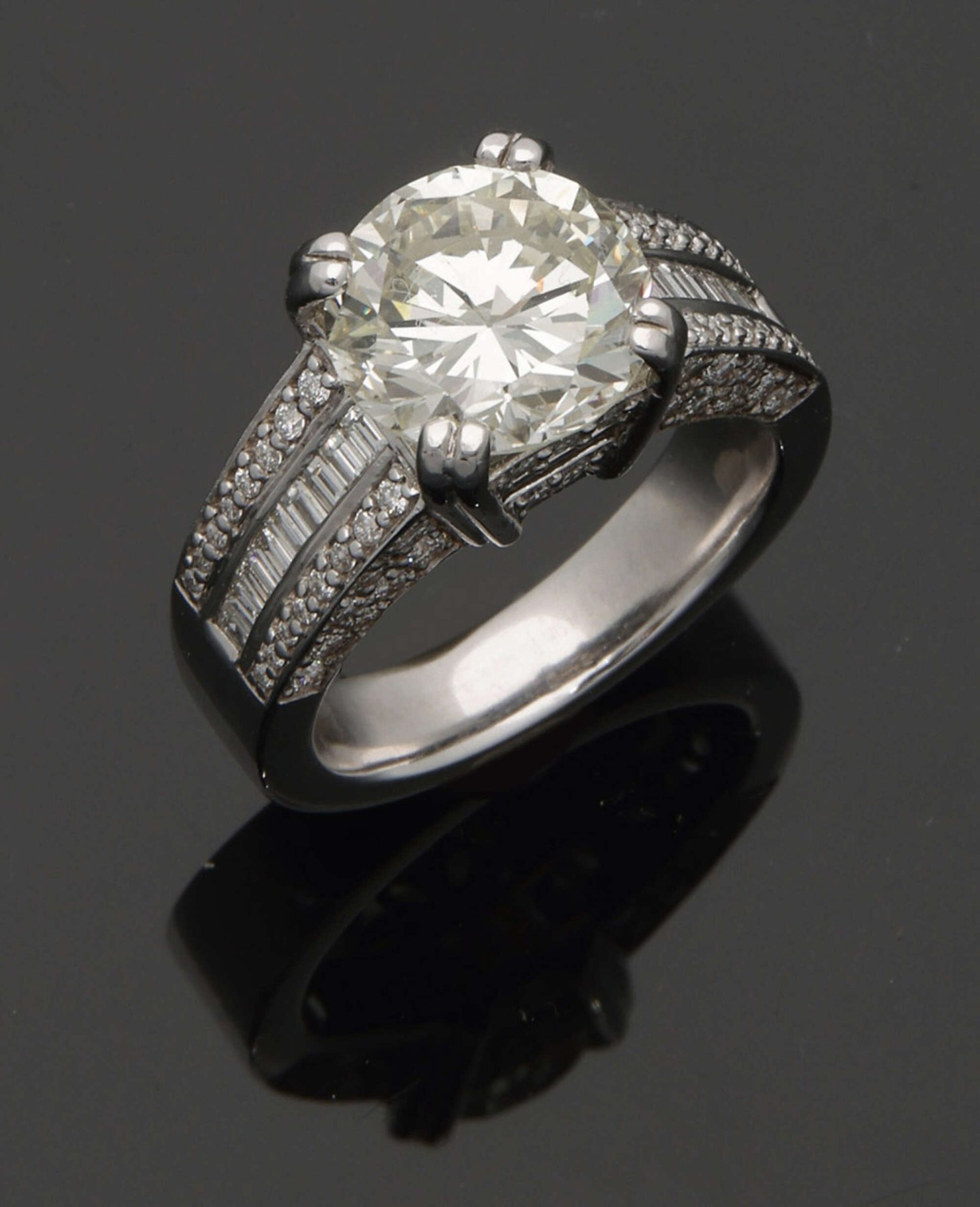Hochqualitätvoller Diamant-Solitärring Weißgold, gest. 750. Zentral besetzt mit einem Altschliff-Diamantsolitär von ca. 4,20 ct. (K/vs), flankiert von Diamantbaguetten von zus. 0,50 ct. (F-G/if-vvs) und Brillanten von zus. ca. 0,68 ct. (F-G/vs). Gew. ca. 12,09 g.