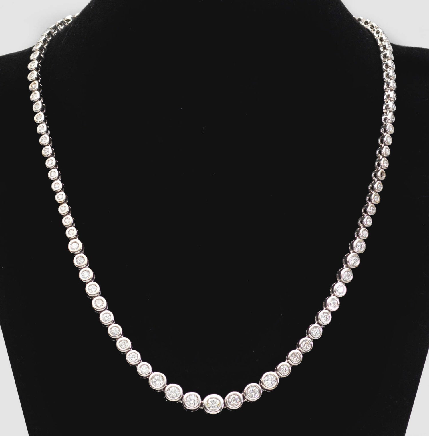 Tennis-Collier mit Brillanten Weißgold, gest. 750. Schauseitig im Verlauf besetzt mit 97 Brillanten von zus. ca. 5,00 ct. (H-K/pi). Gew. ca. 39,40 g.