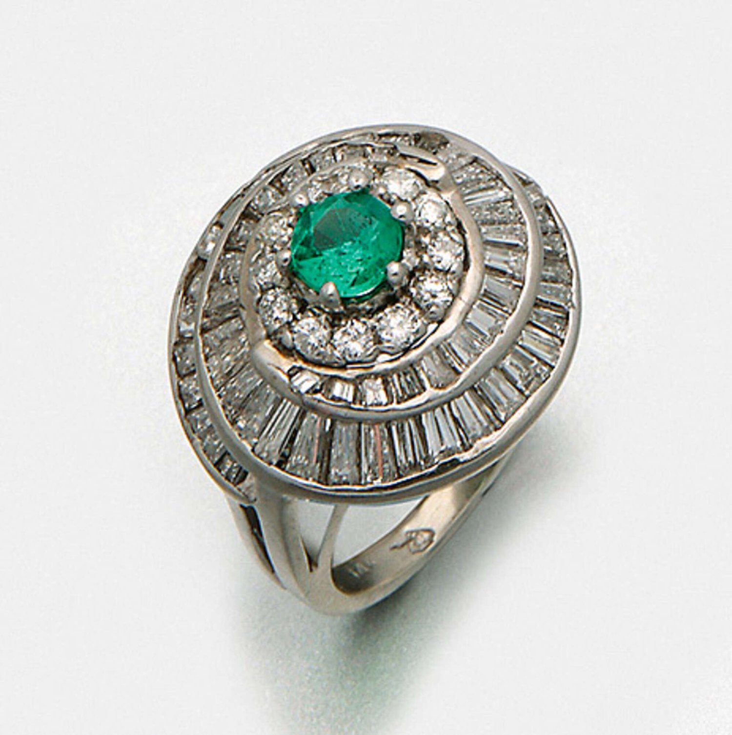 Cocktailring aus den 60er Jahren Weißgold, gest. 750. Zentral besetzt mit einem leuchtendgrünen Smaragd von ca. 0,35 ct., entouriert von Diamanten und Diamant-Trapezen von zus. ca. 2,40 ct.; Gew. ca. 7,49 g.