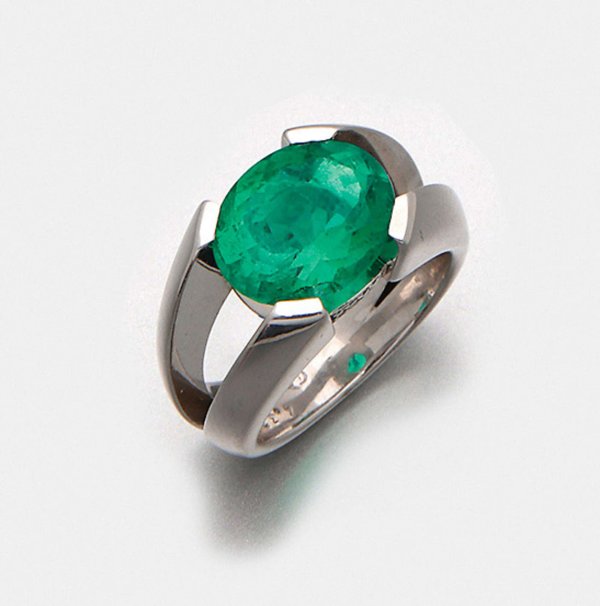 Brasilianischer Smaragdring Weißgold, gest. 750. Zentral besetzt mit einem leuchtendgrünen Smaragd im Ovalschliff von ca. 4,37 ct., unterhalb von kleinen Diamanten entouriert. Sehr feine Goldschmiedeausführung. Gew. ca.15,79 g.