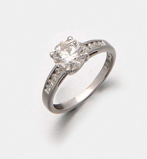 Klassischer Brillant-Solitärring Weißgold, gest. 750. Zentral besetzt mit einem Brillanten von ca. 1,55 ct. (K-L/si2), flankiert von kleinen Brillanten von zus. ca. 0,25 ct. (H/pi). Gew. ca. 3,67 g.