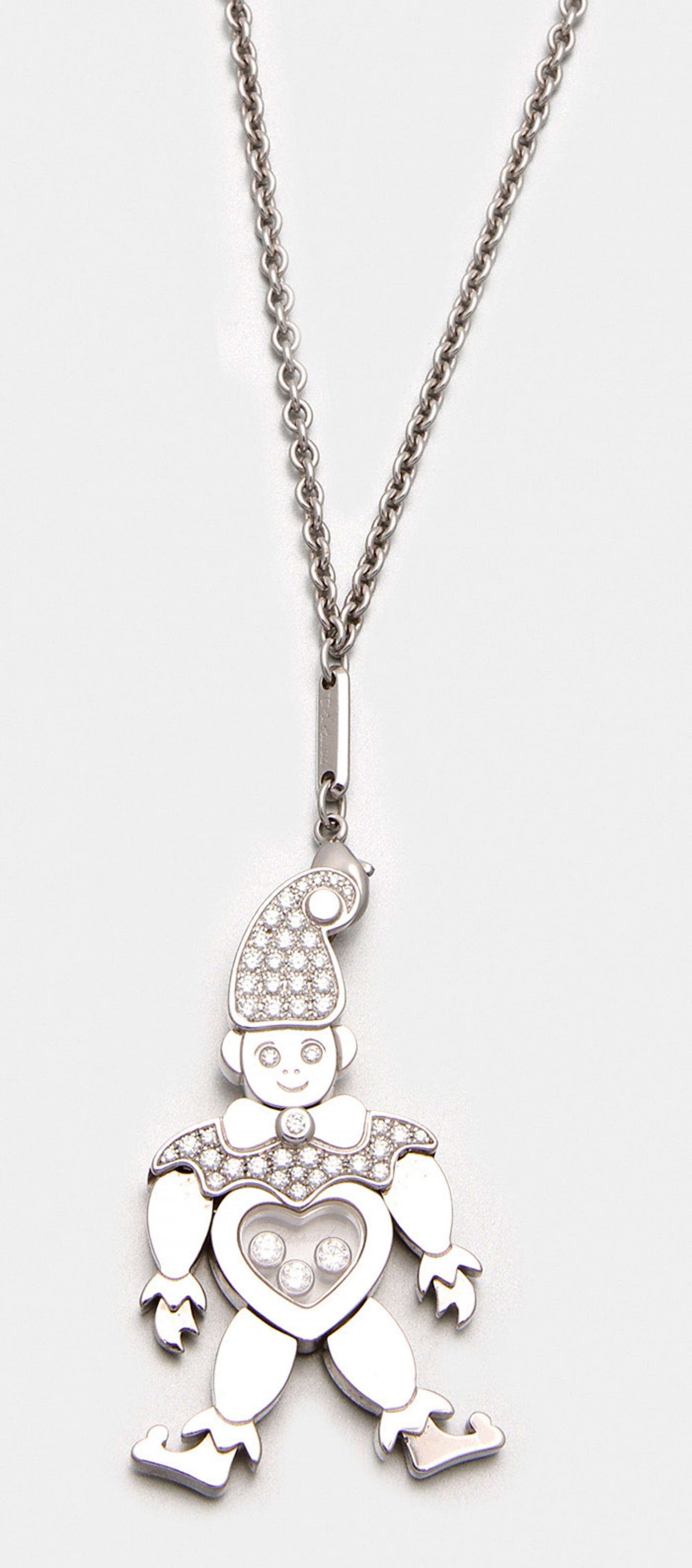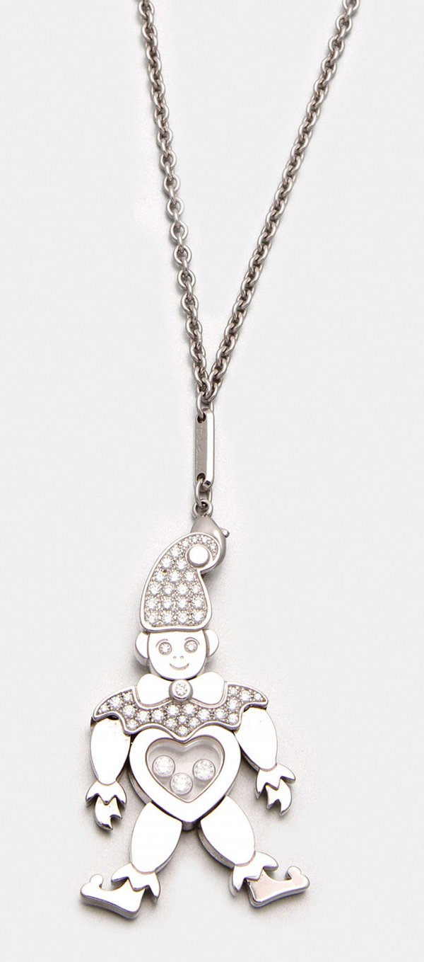 Harlekin-Anhänger mit Sautoir von Chopard aus der Kollektion "Happy Diamonds". Weißgold, gest. 750. Beweglicher Anhänger, schauseitig ausgefasst mit Diamanten von zus. ca. 0,74 ct. sowie drei schimmernden Diamanten von ca. 0,15 ct. (F-G/vvs). Herstellerzeichen. Ref.-Nr. 2384383, 79/3861. Originales Ledersäckchen. Ges.-Gew. ca. 37,05 g.