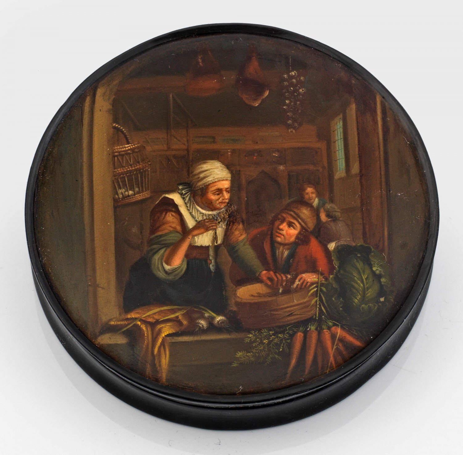 Schnupftabakdose Pappmaché, schwarz lackiert. Rund, mit eingezogener Wandung. Auf dem Deckel holländische Genreszene mit Fischverkäuferin am Marktstand, einem Kunden einen Hering anbietend. Im Hintergrund Blick auf einen Innenraum mit weiteren Personen. Polychrome Malerei nach Vorlage eines Gemäldes von Gerard (Gerrit) Dou (1613-1675) mit dem Titel „Heringsverkäuferin und Junge“. Im Innendeckel französisch betitelt "La Boutiquiére Hollandoise d'après Gerard Dou", im Innenboden Manufakturmarke sowie jeweils nummeriert 13008 in Hellrot. Unterseite craquelliert. Gebrauchsspuren. H. 2 cm. D. 9,6 cm.