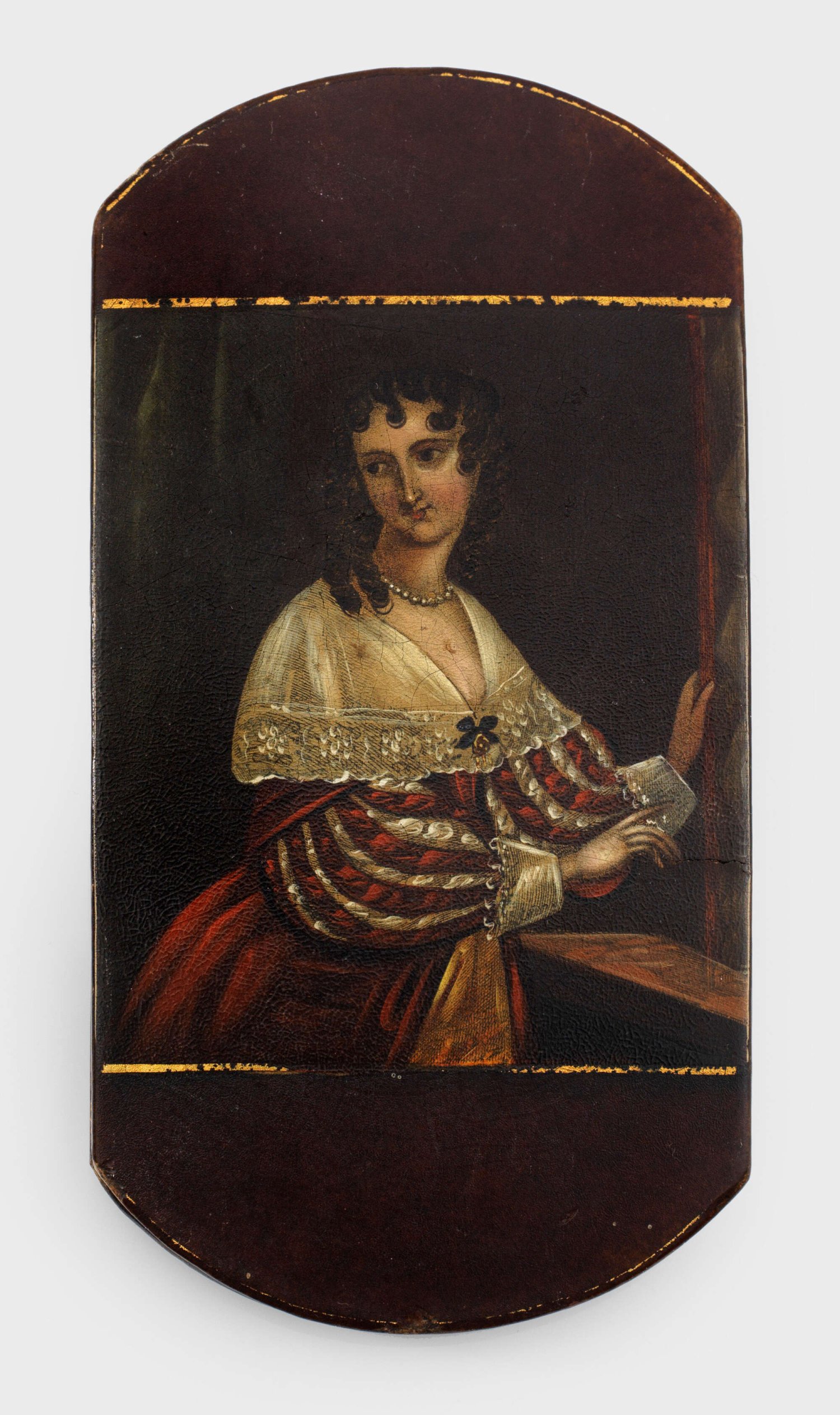 Brillenetui mit zwei Darstellungen und Etui. Pappmaché, schwarz lackiert. Rechteckig mit gerundeten Schmalseiten. Beidseitig goldgerahmte Darstellungen einer jungen, vor einem Vorhang stehenden adeligen Dame bzw. szenische Jagddarstellung. In einer waldigen Landschaft stehende bzw. sitzende Jäger mit erlegtem Wild. Polychrome Lackmalerei. Dazugehöriges Futeral aus geprägtem Leder. Unw. besch.; Brillenetui: 14 cm x 7 cm.