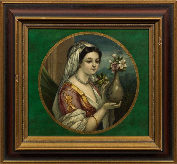 In einem Rundmedaillon Darstellung einer jungen Orientalin in reich geschmücktem Kleid, mit einer Blumenvase. Weiter Landschaftshintergrund. Öl-Lackmalerei/Metalltafel. Verso in Gold nummeriert "24" und Manufakturmarke. 35,5 cm x 41 cm. Rahmen.