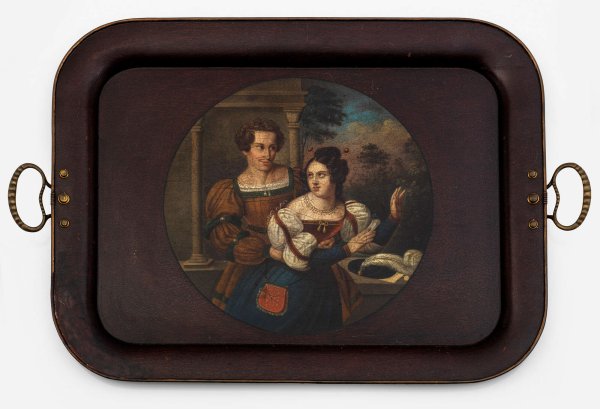 Großes Tablett Weißblech, schwarz lackiert. Rechteckig mit gerundeten Ecken und ovalen Griffen aus Messing. In vertieftem Spiegel szenische Darstellung eines Liebespaares in historisierender, höfischer Kleidung. Im Hintergrund von Architektur begrenzte, baumbestandene Landschaft. Polychrome Lackmalerei. Rest.; 53 cm x 68,5 cm.