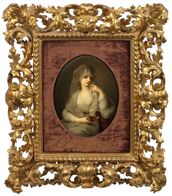 Ovale Bildplatte mit Hüftbildnis einer jungen, neben einem Postament sitzenden Dame in hellem, antikisierendem Gewand als Vestalin gekleidet. Das braune, gelockte Haar von einem hauchdünnen, durchsichtigen Schleier bedeckt. In ihrer linken Hand eine brennende Öllampe haltend. Äußerst feine polychrome Malerei. Aufwändiger in großen Blattrocaillen durchbrochen gearbeiteter, vergoldeter Stuckrahmen mit brauner Samtblende. 56 cm x 50 cm. 27 cm x 21 cm.