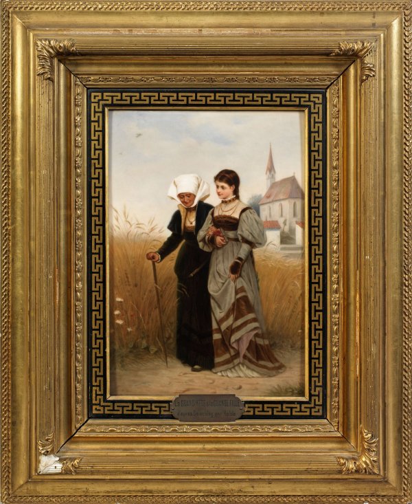 Rechteckige Bildplatte mit szenischer Darstellung einer älteren Dame und eines Mädchens in sommerlicher Landschaft, nach dem Kirchgang auf dem Weg nach Hause. Nach einem Gemälde des Münchner Genremalers Robert (Julius) Beyschlag (1838-1903). Äußerst feine polychrome Malerei. Rücks. alter Klebezettel, handschriftlich in Englisch bez. "copied by Maltz" und bet. "age and youth"; Vergoldeter Stuckrahmen mit Mäanderleiste sowie Metallplakette, frz. bez. "La grand'mere & la grande fille (...)par Hohle". Eingepresste Zepter- und KPM-Marke. Platte 32 cm x 25 cm.