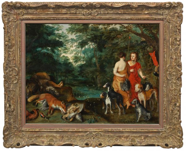 Die Szenerie ist in eine dicht bewaldete Landschaft komponiert, durch die sich annähernd im Goldenen Schnitt eine tiefenräumliche Schneise mit einer Aue zieht, vor dieser ist bühnenartig die eigentliche Handlungszone im erhöhten, schattig abgesetzten Vordergrund mit den Figuren und Tieren gestellt. Hierdurch verbinden sich in dem Gemälde verschiedene Bildgattungen - Waldlandschaft, mythologische Szene und Tierdarstellung. Auf der rechten Bildseite werden die beiden von Hendrick von Balen ausgeführten Nymphen in ockergelben und leuchtend roten Kleidern dargestellt, Speere und ein erlegtes Perlhuhn haltend; vor ihnen eine Meute aus fünf unterschiedlichen Jagdhunden; an einem Baum hängend ein Jagdhorn und ein gefüllter Pfeilköcher. Demgegenüber sind auf der linken Bildseite unterschiedliche, erlegte Tiere über- und nebeneinander geschildert, u. a. ein Wildschwein, ein Wolf, ein Fuchs, ein Kaninchen, Fasane, ein Reiher und andere Wildvögel. Verstärkt durch die fein lasierende Malweise des Tafelbildes wirken die eingehend studierten Tiere insbesondere in den Darstellungen der Hunde überaus lebendig bzw. auch in der erlegten Jagdbeute naturwahr. Dieses Gemälde dürfte laut Klaus Ertz noch vor der Italien-Reise von Jan Brueghel dem Jüngeren um 1621/22 entstanden sein. Bei dem Jan Brueghel und Hendrick van Balen in Zusammenarbeit geschaffenen Gemälde handelt es sich um eine leicht abgewandelte Version des väterlichen, um 1620 entstandenem Werk Jan Brueghel dem Älteren (1568 - 1625) in der Alten Pinakothek in München (Inventar-Nr. 850), der ebenfalls den begabten und befreundeten Figurenmaler Hendrik van Balen für die Nymphenfiguren herangezogen hatte. Jan Brueghel der Jüngere lernte van Balen bereits um 1618-1620 unmittelbar im Atelier seines Vaters kennen, wie eine Reihe von Gemälden, an denen beide gearbeitet haben, belegt. Nach der Rückkehr aus Italien und mit Übernahme der Werkstatt des zu Jahresanfang verstorbenen Vaters im Jahre 1625 wurde die Zusammenarbeit der beiden Künstler sehr intensiv und endete erst mit dem Tod van Balens 1632. Hendrick van Balen wurde in diesen sieben Jahren für Jan Brueghel den Jüngeren zum wichtigsten Mitarbeiter und hatte ganz wesentlichen Anteil daran, dass dieser mit dem übernommenen Atelier des Vaters so schnell in Antwerpen Fuß fassen konnte. Nachdem 1625 Jan Brueghel der Jüngere auch Mitglied der Lukasgilde geworden war und er 1626 Anna Maria Janssens, Tochter des berühmten Malers Abraham Janssens in der Antwerpener Kathedrale geheiratet hatte, begann die bis in die 1630er Jahre währende, erfolg- und schaffensreichste sowie glückvollste Phase seines Lebens, zumal er 1630 und 1631 auch als Dekan der Gilde wirkte. 1647 ernannte ihn Erzherzog Leopold Wilhelm zum Hofmaler und Konservator seiner bedeutenden Kunstsammlung, weitere Aufträge erhielt er in Verbindung hiermit danach auch vom österreichischen Hof. Öl/Eichenholztafel, parkettiert. 58,5 cm x 80 cm. Rahmen.
