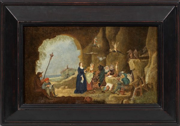 Szenische Darstellung am bogenartigen Eingang einer Grotte mit Landschaftsausblick. Die Komposition des in fein lasierender Malerei ausgeführten Kabinettbildes basiert auf einem wesentlich größeren, auf Leinwand gemalten Ölbild Teniers aus dem Jahr 1647, das sich einst im Kaiser-Friedrich-Museum bzw. der Staatl. Gemäldegalerie in Berlin befand und seit 1945 verschollen ist. Öl/Eichenholztafel, alt parkettiert. 19,5 cm x 34,5 cm. Rahmen.