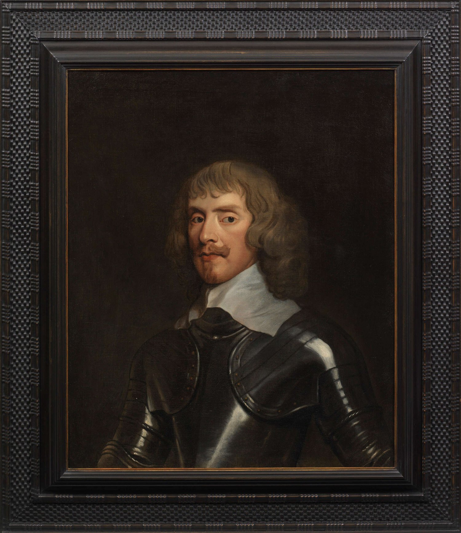 Repräsentatives Brustbildnis im Halbprofil, der Dargestellte in einem glänzend polierten Harnisch, über dem auf die Schulter ein weißer, breiter Kragen fällt. Lt. Erik Larsen handelt es sich bei diesem Gemälde um "ein gut erhaltenes und geschickt ausgeführtes Werk des Meisters." In der Tat gelingt es Anthony van Dyck hierin höchst virtuos die Persönlichkeit des Feldherrn zu charakterisieren und das Gesicht durch ein fein nuanciertes Inkarnat und eine subtil eingesetzte Lichtführung plastisch wirken und lebenswahr erscheinen zu lassen. Die Identifizierung des Dargestellten Thomas Fairfax (1612 - 1671) basiert auf der Tradition. Fairfax war einer der wichtigsten englischen Heerführer während des Bürgerkriegs. 1639 wurde er vom König für seine Verdienste im Feldzug Karls I. gegen die Schotten zum Ritter geschlagen. Mit dem Ausbruch des Bürgerkriegs im Jahr 1642 trat Fairfax jedoch auf die Seite der Regierung und schloss sich den parlamentarischen Streitkräften an, die eine wichtige Rolle bei der Niederlage der royalistischen Armee in der Schlacht von Marston Moor im Jahr 1644 spielten. 1645 ernannte ihn das Parlament zum gemeinsamen Oberbefehlshaber mit Oliver Cromwell, verantwortlich für die Kavallerie, und es war Fairfax' militärisches Genie, das die Parlamentsarmee ("New Model Army") zu einer disziplinierten Streitmacht formte. Es war diese Armee unter dem Kommando von Fairfax, die den Royalisten in Naseby im Juni 1645, der entscheidenden Schlacht des Krieges, eine vernichtende Niederlage zufügte. Trotz seiner Treue zum Parlament während des Krieges lehnte Fairfax die Hinrichtung Karls I. im Jahr 1649 ab und trat im folgenden Jahr aus Protest gegen Cromwells Feldzug gegen Schottland von seinem Kommando zurück. Er zog sich aus dem öffentlichen Leben zurück, bis er 1660 General Monck bei seinem erfolgreichen Versuch unterstützte, Karl II. auf den Thron zurückzubringen und die Monarchie wiederherzustellen. Porträtiert hat ihn der flämischer Barock-Künstler Anthony van Dyck, der nach Erfolgen in den südlichen Niederlanden und Italien zum führenden Hofmaler in England wurde und für die nächsten 150 Jahre die englische Porträtmalerei entscheidend prägte. Schon als Kind stellte sich sein außergewöhnliches Talent heraus, er lernte bei Hendrik van Balen, bereits mit 16 Jahren hatte er ein eigenes Atelier inne und 1618 wurde er als Meister in die Antwerpener Gilde aufgenommen. Zu diesem Zeitpunkt arbeitete er im Atelier von Peter Paul Rubens, der großen Einfluss auf seine Arbeit erlangte. 1632 berief ihn Karl I. von England nach London. Mit Ausnahme von Hans Holbein d. J. war van Dyck neben seinem spanischen Zeitgenossen Diego Velázquez einer der ersten Maler von herausragendem Talent, der hauptsächlich als Hofporträtist arbeitete und dieses Genre gründlich revolutionierte. Bekannt und bedeutend wurde er durch seine künstlerisch höchst souverän gemalten, eleganten Porträts, insbesondere der Aristokratie, König Karl I. von England, seiner Familie und seines Hofstaates. Diese waren so gefragt, dass er eine florierende Werkstatt in London gründete. Neben der Royal Collection, die immer noch viele seiner Gemälde besitzt, zeigen bedeutende internationale Sammlungen Beispiele seiner hohen Porträtkunst, darunter die National Gallery in London, der Prado in Madrid, der Louvre in Paris, die Alte Pinakothek in München, die National Gallery of Art in Washington DC sowie das Museum of Fine Arts in Boston und die Frick Collection in New York. Öl/Lwd.; 76 cm x 63 cm. Rahmen.