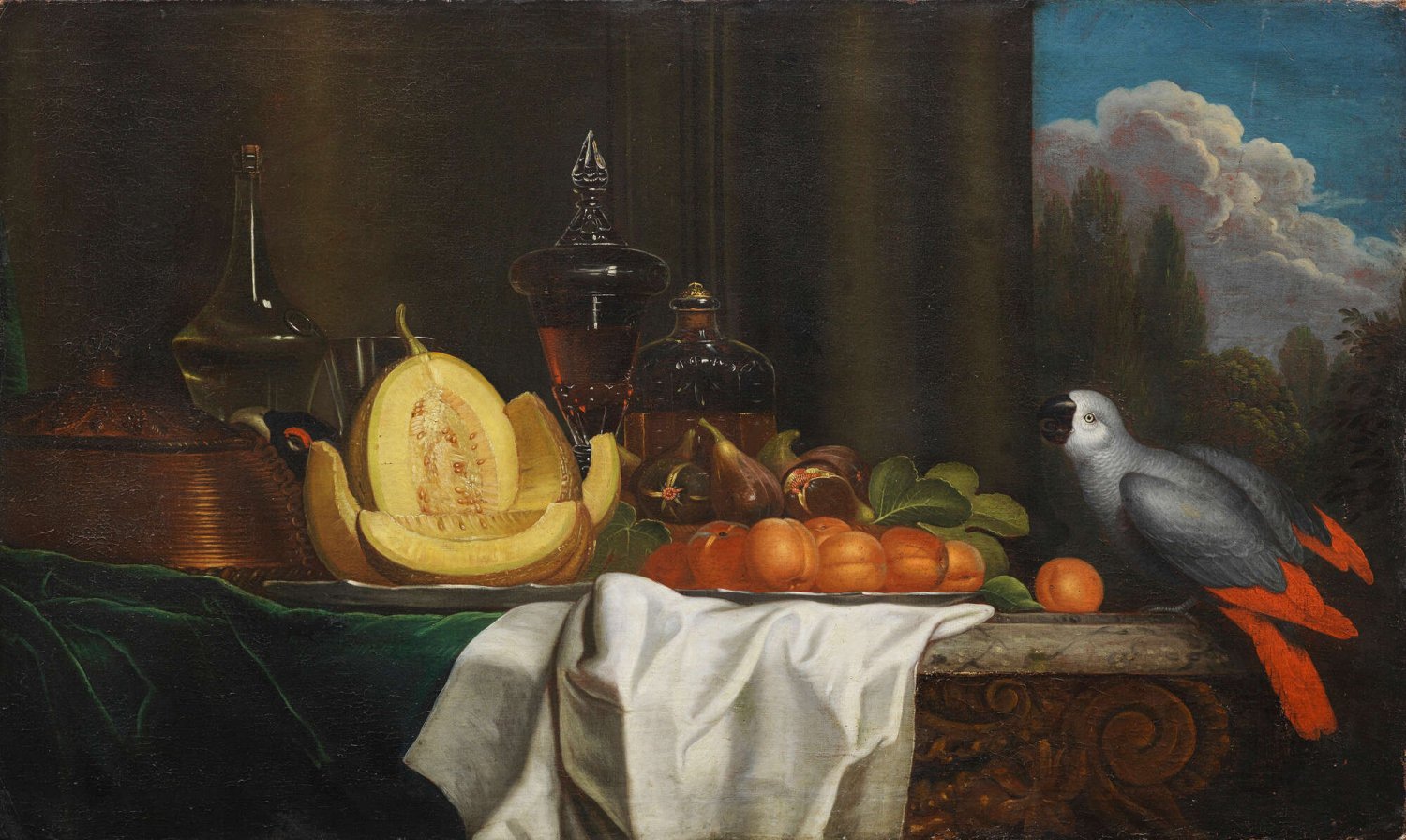 Auf einem steinernen Tisch nebst Glasobjekten arrangierte südländische Früchte, die einen Papagei anlocken. Bodany, der 1684 nach Amsterdam ging und 1688 in London ansässig wurde, war ein spezialisierter Stillleben- und Vogelmaler am Hofe von Queen Anne und gefragter Künstler des Hochadels. Mit Vorliebe schilderte er exotische Vogelarten, insbesondere mit rotem Gefieder, die er in Landschaften und Stillleben komponierte. Öl/Lwd.; 69 cm x 115 cm.