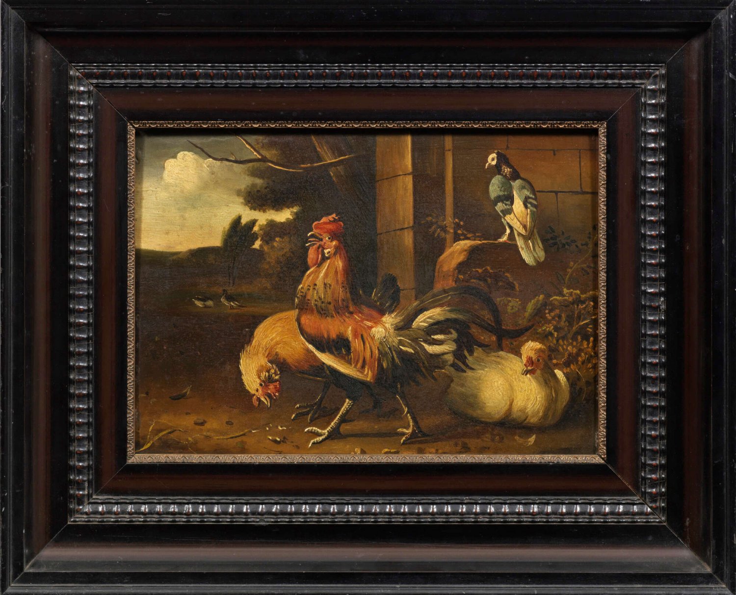 Der auf Vogeldarstellungen spezialisierte Maler beeinflusste, wie es auch in diesem Tierstück augenfällig ist, wesentlich die Tiermalerei des Barock mit diesem Themenkreis. Ein Hauptmotiv im Oeuvre Hondecoeters bildete der stolzierende Hahn, umgeben von Hennen vor einem Gebäude. Öl/Holztafel. 27 cm x 39 cm. Rahmen.