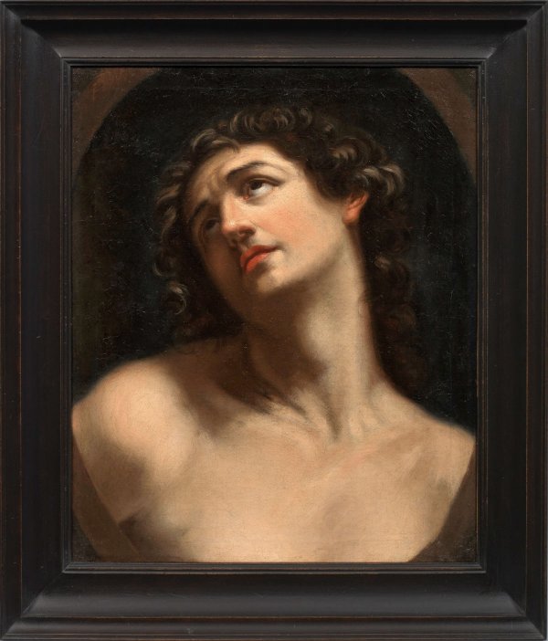 In ein Oval komponiertes Bildnis des Hl. Sebastian, der als christlicher Märtyrer seit der Renaissance ein sehr beliebtes Thema in der Malerei war. In diesem Gemälde sind nur der Kopf und die Schultern des Heiligen sichtbar, aber er ist eindeutig unbekleidet und wird gefoltert, während sein Kopf nach links gedreht wird und seine Augen zum Himmel blicken. Die ausschnitthafte Darstellung basiert auf dem berühmten Gemälde von Guido Reni im Prado von Madrid, in welcher der Heilige in einer Landschaft in Dreiviertel-Länge gezeigt wird, wobei ein Pfeil in seinem Oberkörper deutlich sichtbar ist. Eine zweite Version der dreiviertellangen Komposition existiert im Louvre in Paris, aber die Prado-Version wird als ursprüngliches Original angesehen und stammt aus der Zeit um 1617-1619. Diverse andere eigenhändige Repliken, Kopien und Abwandlungen existieren, wodurch eine Zuschreibungsproblematik resultiert. Zu den mit diesem Werk vergleichbaren Gemälden gehört eine Version mit ähnlicher, ausschnitthafter Komposition im Oval, welche der Werkstatt von Guido Reni zugeschrieben wird und die sich in der Royal Collection im Windsor Castle Inv. Nr. RCIN405562 befindet. Öl/Lwd., doubl.; 56 cm x 46 cm. Rahmen.