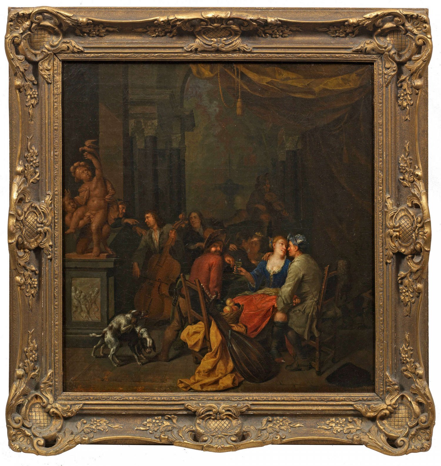 Die in eine Palast-Architektur komponierte Szene schildert eindringlich die Ausschweifungen und Versuchungen im Zeitalter des Barock. Dicht gedrängt wird eine Gesellschaft gezeigt, die sich zur Musik dem Weingenuss und der Liebe hingibt. Durch eine effektvolle Lichtführung und leuchtendes Kolorit hervorgehoben ist eine junge Frau, offenbar eine Prostituierte, mit erhobenem Weinglas, die von einem neben ihr sitzenden Mann umarmt wird. Als unzweideutige, drastische, moralisierende Anspielung auf dieses Paar hat der Künstler auf der linken Bildseite kopulierende Hunde dargestellt. Währenddessen hat sich ein junger Mann in der Mitte des Vordergrundes zum Betrachter umgedreht, wodurch dieser direkt einbezogen wird. Das fein gemalte Genrebild gehört zu den überaus seltenen Motiven des Künstlers aus diesem Themenkreis, aus dem sich sonst nur ganz wenige vergleichbare Gemälde erhalten haben. Balthasar van den Bossche lernte bei Gerard Thomas in Antwerpen und wurde 1697 Mitglied der dortigen Gilde. Schwerpunkt seines Schaffens waren Interieurs, insbesondere Darstellungen von Maler- und Bildhauerateliers. Öl/Lwd., doubl.; R. u. sign.; 63 cm x 59,5 cm. Rahmen.