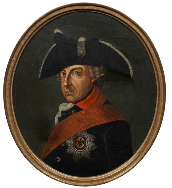 Um 1765-1780 entstandenes, repräsentatives Brustporträt des Monarchen in Uniform, mit Dreispitz, orangeroter Ordensschärpe und Bruststern des Schwarzen Adlerordens. Das den König ausdrucksvoll charakterisierende Porträt variiert eines der zahlreichen Bildnisse Frankes, die der Hofmaler mit seiner florierenden Werkstatt ab 1763/64 schuf. Öl/Lwd., alt auf Karton; 59,5 cm x 51 cm, im Oval. Rahmen.