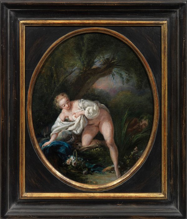 Szenische Darstellung mit einer badenden Nymphe unter einer Weide am Ufer, die von einem jungen Pan überrascht wird und sich schamhaft eiligs mit einem Tuch bedeckt. Die Lichtführung akzentuiert effektvoll die in hellem Kolorit gemalte Aktfigur und einem am Boden stehenden Blumenkorb mit Rosen. Das ovale, mit weichem Schmelz gemalte Rokoko-Bild, dessen Darstellung auch als "Pan und Syrinx" betitelt werden kann, variert ein Motiv, welches Boucher bereits 1736 in einem bekannten Gemälde schilderte, das sich heute im Staatl. Palast-Museum von Archangelskoje in Krasnogorsk bei Moskau befindet. Boucher, der als einer der bedeutendsten Maler des französischen Rokoko gilt, war Hofmaler König Ludwig XV. und favorisierter Maler der Marquise de Pompadour. Sein Oeuvre umfasst sowohl galante Szenen als auch laszive, allegorische und mythologische Motive. Boucher kombinierte und variierte in einer Reihe von Gemälden höchst geschickt amouröse, erotische und mythologische Themenkreise, indem er badende Nymphen, Diana, Pan und Syrinx, Venus und Liebespaare darstellte. Auch der Überraschungsmoment kehrt mehrfach in Bouchers Oeuvre wieder. Öl/Lwd., alt auf Papier kaschiert. 32,5 cm x 27 cm, im Oval. Rahmen.