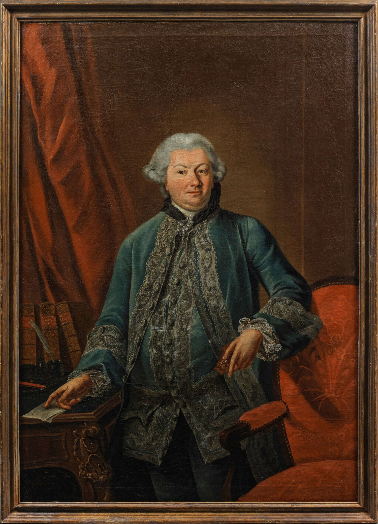 Repräsentatives, überlebensgroßes Kniestück, das einen gelehrten und wohlhabenden Herrn von hohem Stand - wohl eines Adeligen, Ministers oder anderen hohen Staatsbeamten - in kostbar gearbeiteter Kleidung mit türkisfarbenem, silberbesticktem Justaucorps und weißer Spitze zeigt. Dieser steht zwischen einer rot gepolsterten Bergère und einem Schreibtisch mit Büchern und Schreibzeug, mit der rechten Hand deutet er auf ein Dokument, mit der Linken hält er eine goldene Tabatiere. In seiner Stofflichkeit, Komposition der Figur und subtilen Charakterisierung ist das Gemälde ein herausragendes Beispiel für die von Johann Heinrich Tischbein dem Älteren beeinflusste deutsche Porträtkunst in der 2. Hälfte des 18. Jhs.; Specht wurde 1771 an den herzoglichen Hof nach Gotha berufen. Außer der Herzogsfamilie und der Aristokratie in Thüringen porträtierte er auch bedeutende Gelehrte, Wissenschaftler und Schriftsteller wie Lichtenberg und Wieland. Öl/Lwd.; L. u. am Schreibzeug sign. "Specht". 160 cm x 116 cm. Rahmen.
